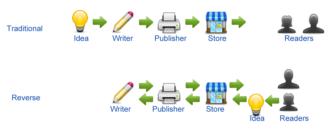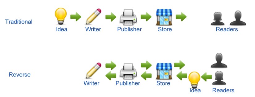 A book idea traditionally originates with a writer who finds a publisher who finds stores who ideally find readers. Basically the reverse model starts with stores who’ve found reader demand and who then find publishers who then find writers.